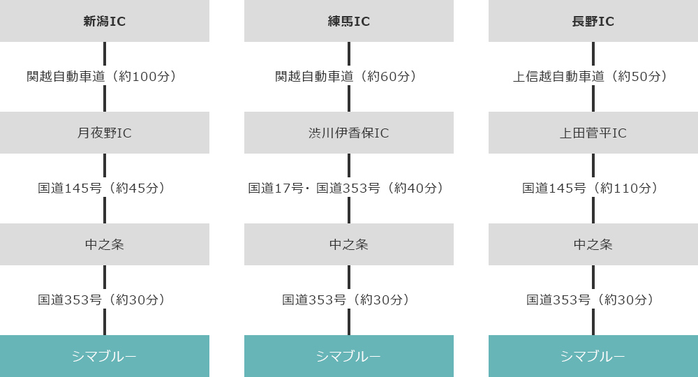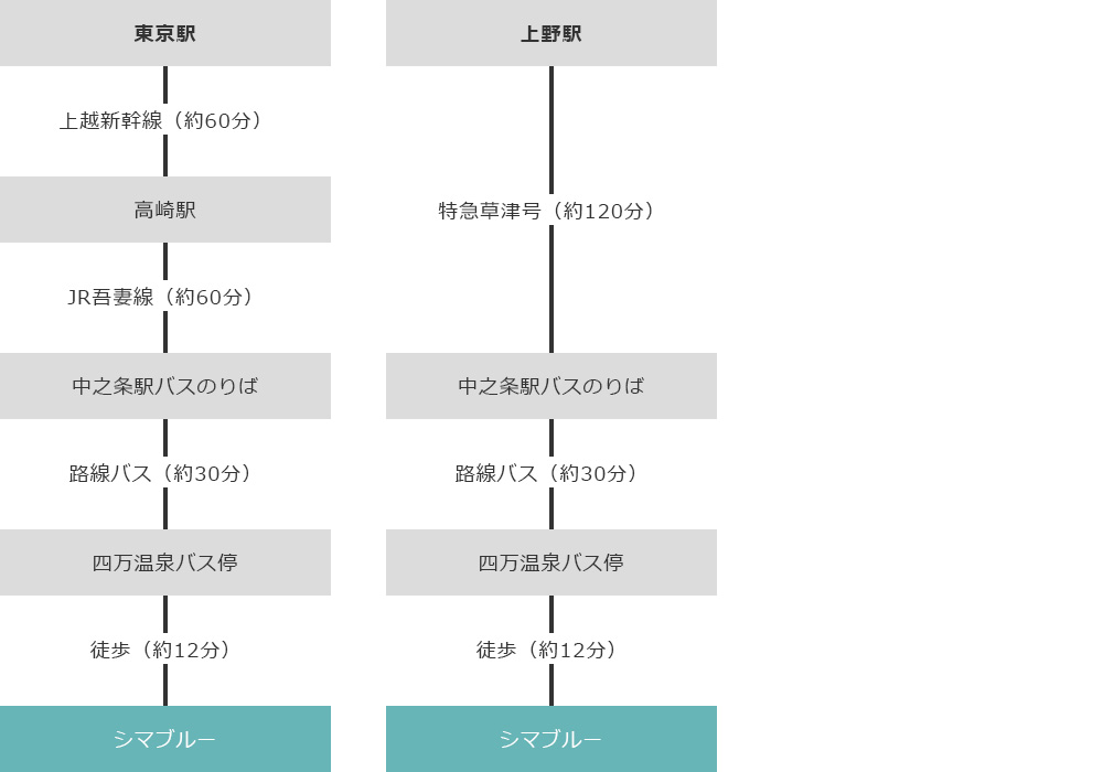 ・「中之条駅」より「シマブルー」までは、タクシーで約30分となります。