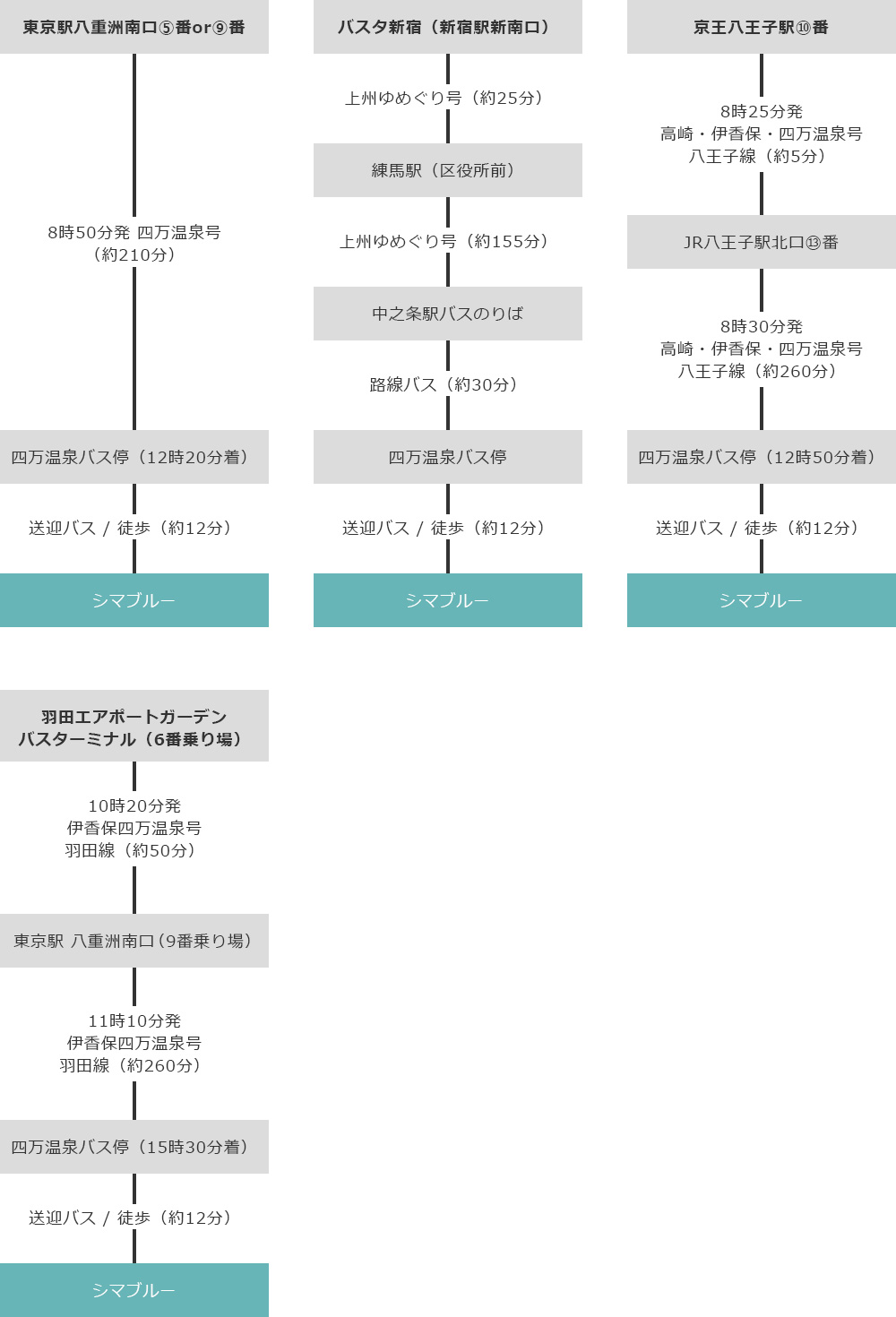・「四万温泉バス停」から「シマブルー」までは徒歩で約12分となります。