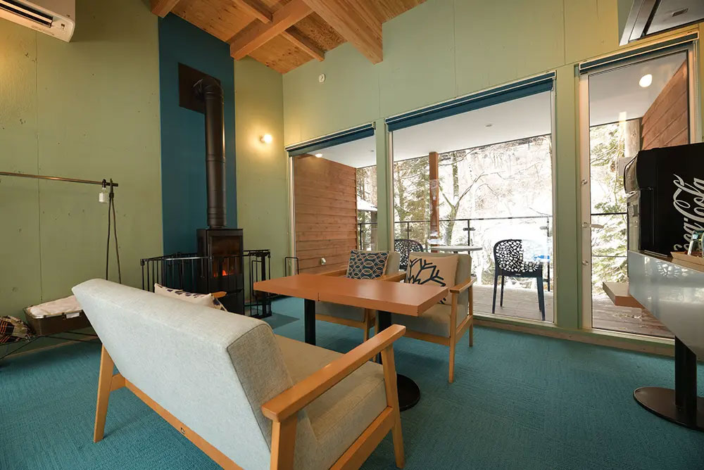 キャビンのテーマは「ナチュラルな明るさ」。一階には四万川の流れる楓仙峡に面した開放的な温泉半露天風呂と、プライベートバーベキューを楽しんでいただける展望テラス。広いリビング・ダイニングで快適にお寛ぎください。二階には自然と融合するアウトドアリビングとベッドルーム、展望テラスがございます。