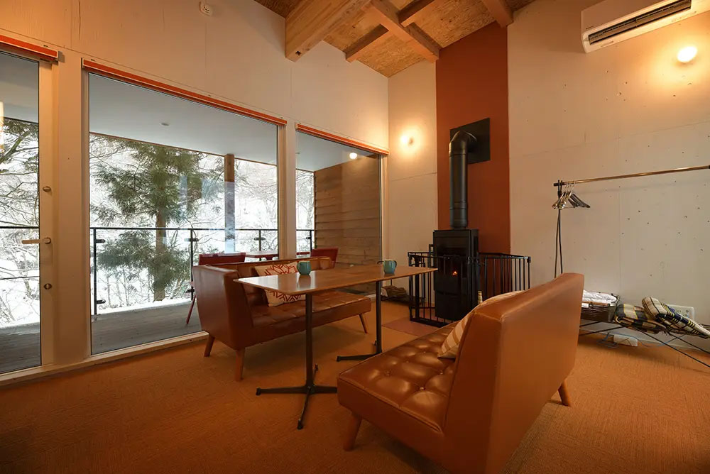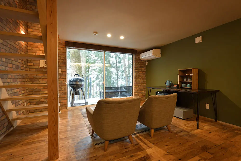 広々と開放的なキャビンのテーマは「自然との融合」。開放的な一階の温泉半露天風呂には温かな源泉の湯。森を眺める開放的な展望テラスには、プライベートにバーベキューを楽しめる焼台をセットしています。風が吹き抜ける二階のアウトドアリビングやボルダリングウォールなど遊び心があふれています。