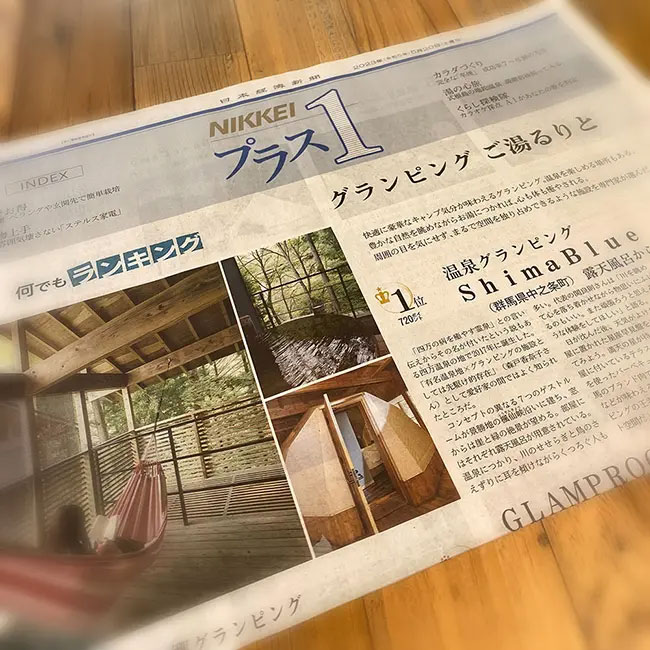 「日経新聞」土曜日朝刊の別刷〈NIKKEIプラス1〉の特集「なんでもランキング」にて、シマブルーを掲載いただきました。豊かな自然に包まれる「楓仙峡」沿いのロケーションや、コンセプトの異なる「7つのゲストルーム」について取り上げていただきました。