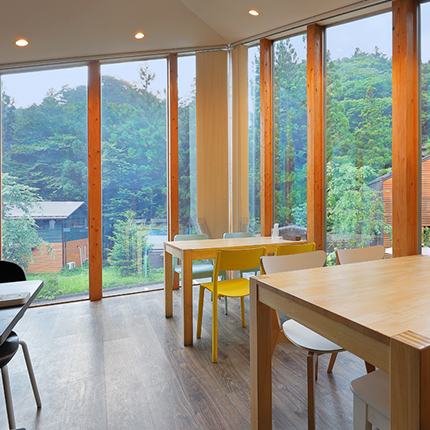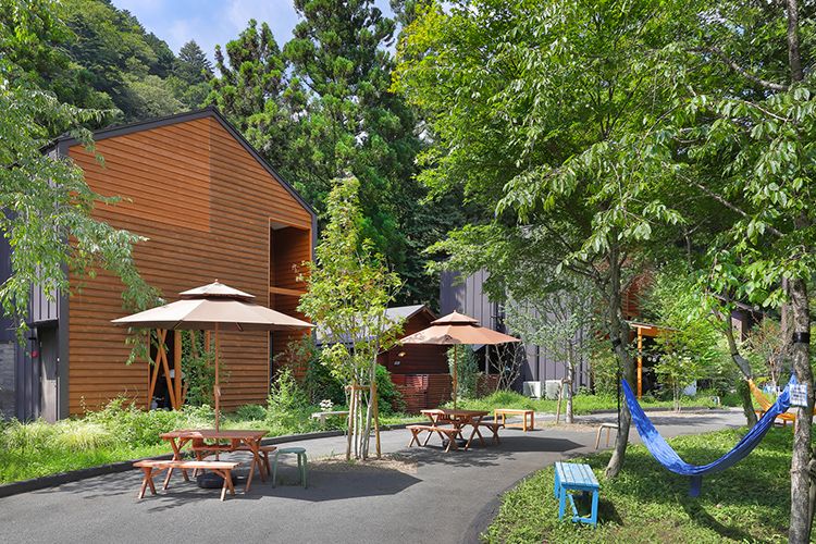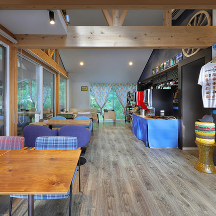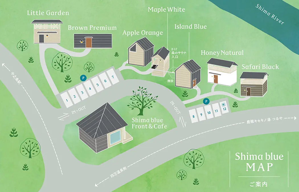 国立公園内に位置する自然豊かなシマブルーの敷地内には、シマブルーフロント&カフェを中心に7つの個性的なコテージが四万川に沿って佇んでいます(コテージ同士の距離は数メートルほどです)。