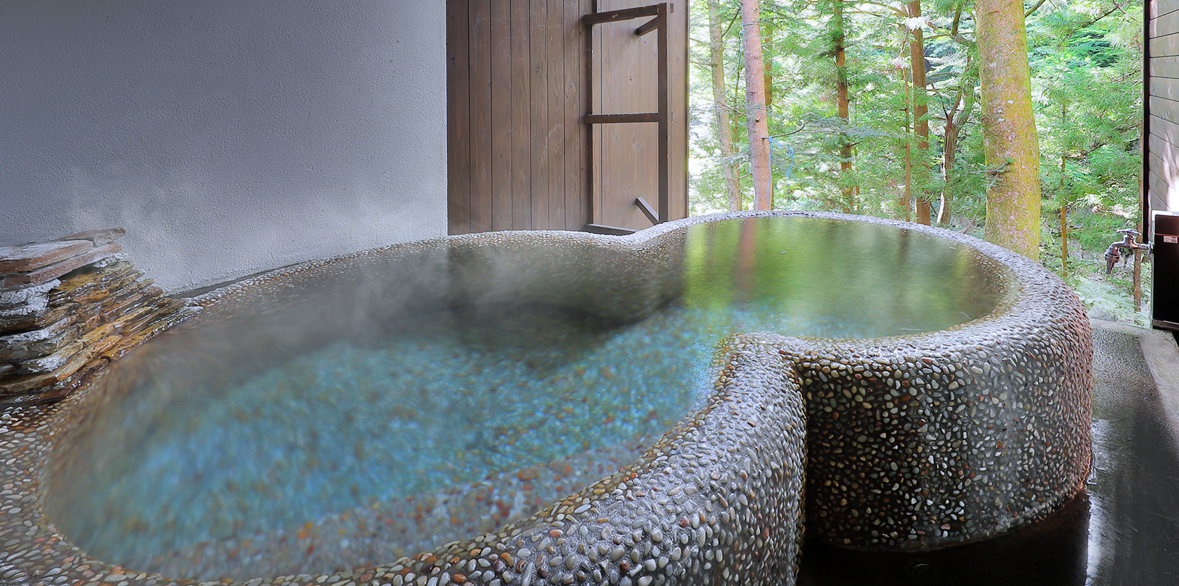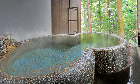 せせらぎの音色に包まれた露天風呂は洗い出し技法で造られたユニークなひょうたん型。
