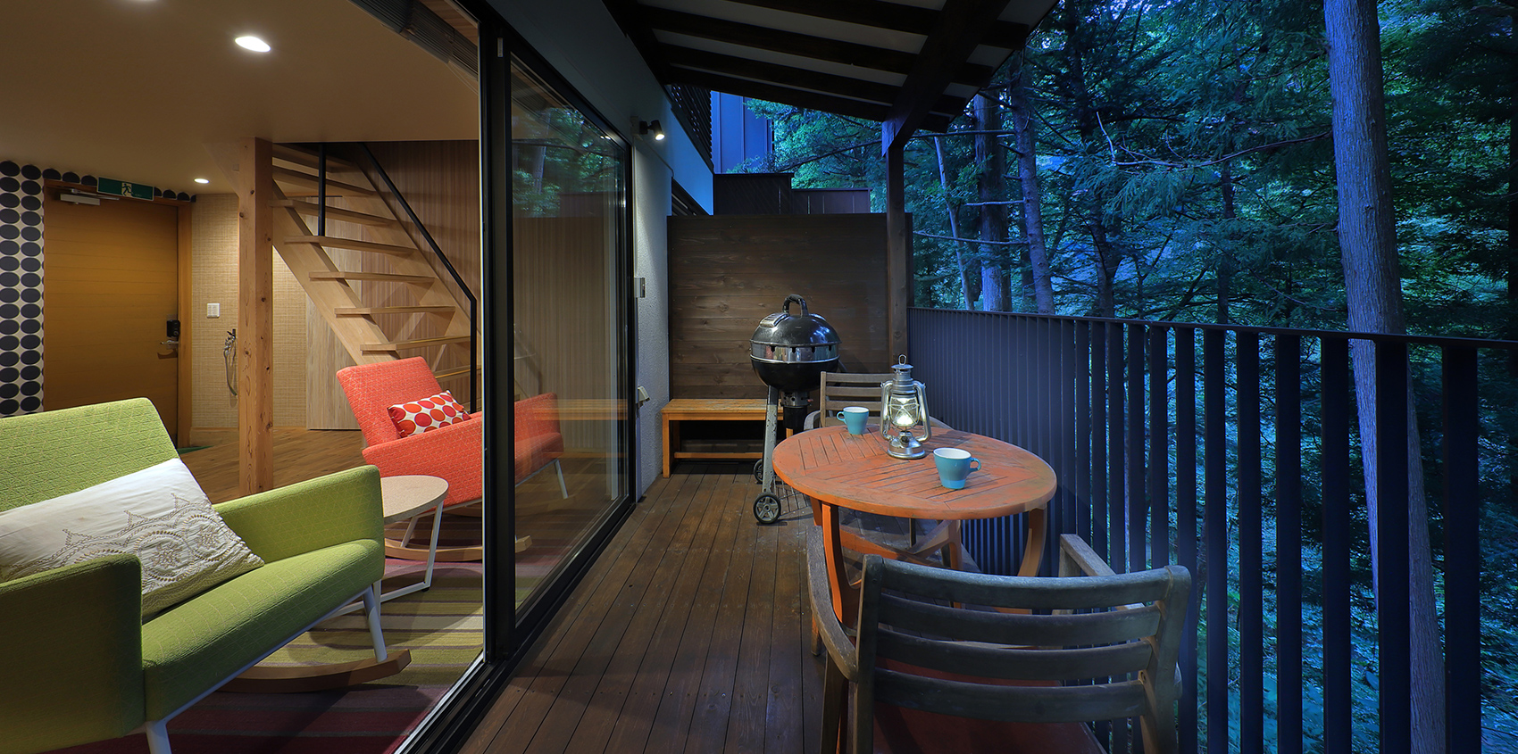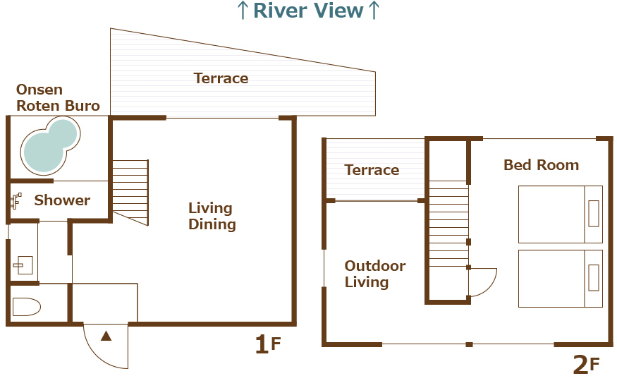 <1F> 温泉半露天風呂+リビング・ダイニング+展望テラス(BBQ焼台 炭グリル)+シャワー+トイレ+洗面所 <2F>アウトドアリビング+ベッドルーム(セミダブルロングベッド×2)+展望テラス