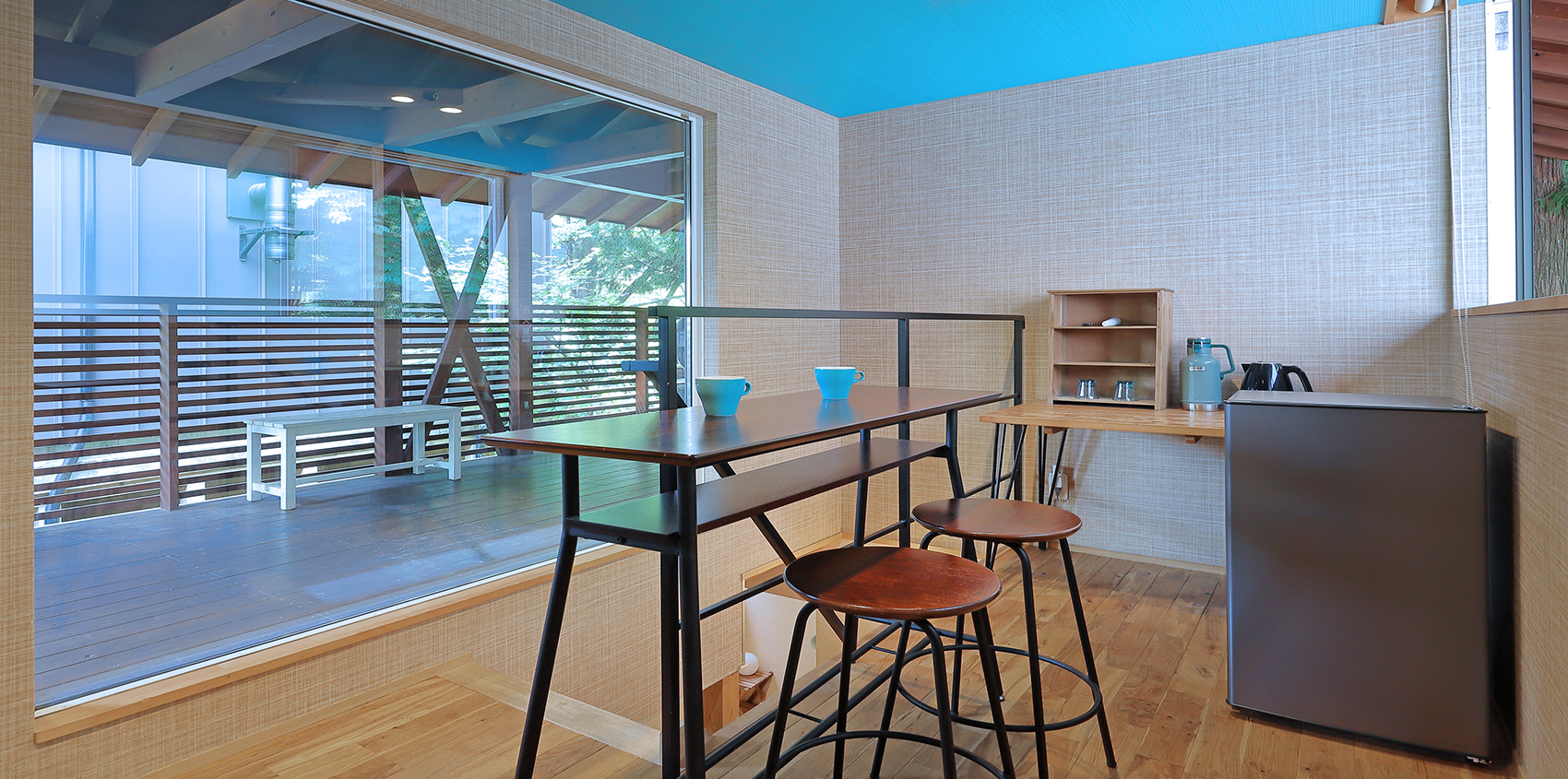 まるで隠れ家の様な雰囲気に、ゆったりだるまチェアーがございます。お部屋の中で旅の計画を練るのも良し、テラスで森林浴も良し。色々な雰囲気を楽しむ事の出来るお部屋となっております。