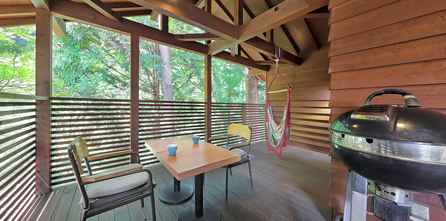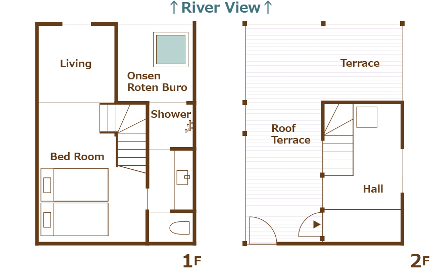<2F> リビング+展望テラス(ハンモック・BBQ焼台 ガスグリル) <1F> 温泉露天風呂+リビング+ベッドルーム(シングルベッド×2)+シャワー+トイレ+洗面所