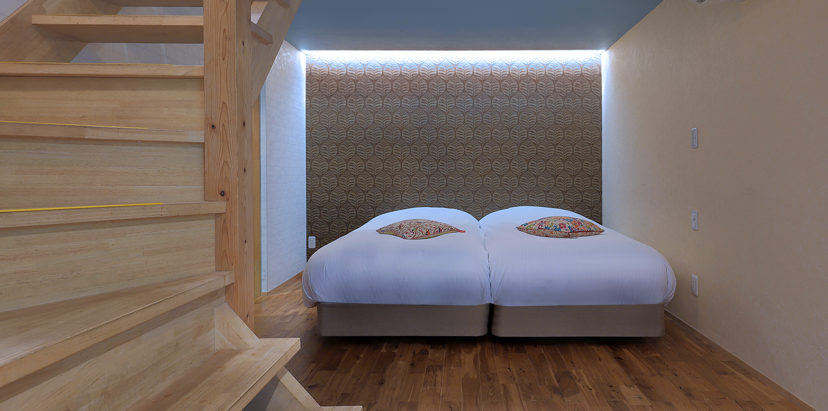 アプローチは2Fで、同フロアにリビングとBBQテラス、階下の1Fに寝室がある隠れ家的雰囲気のお部屋です。