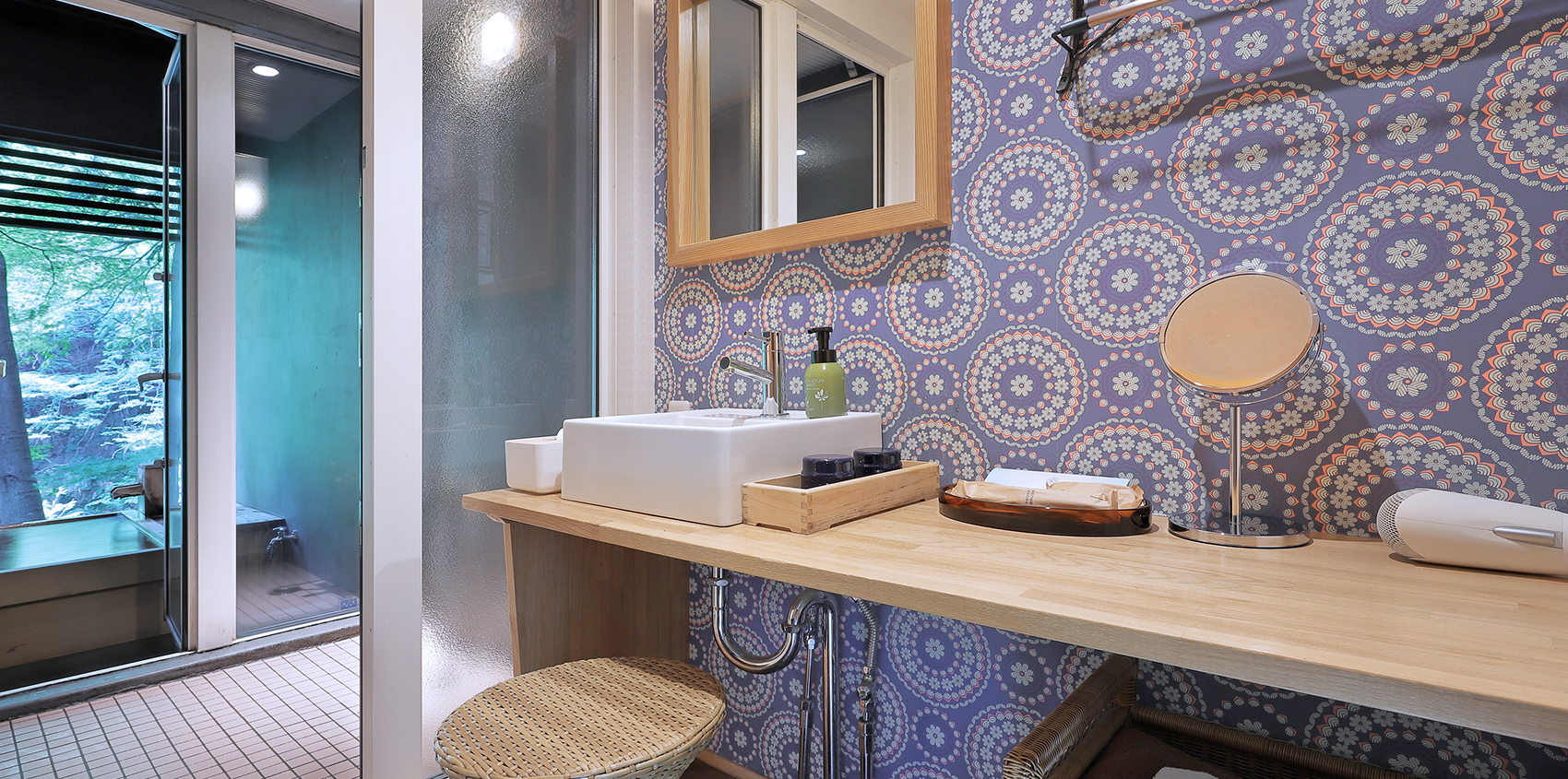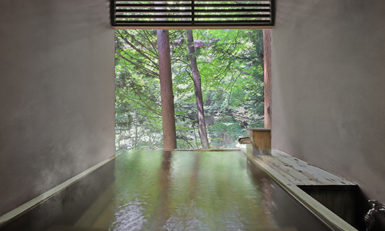 お風呂は広々とした檜風呂をご用意。森の四季を切り取った丸窓デザインや
